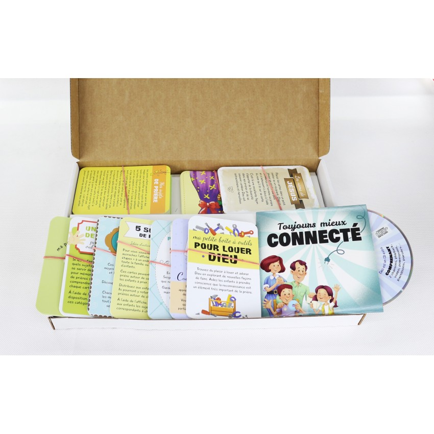 Une touche de fun pour parler à Dieu. Dans cette boîte, vous découvrirez une foule de jeux et d’activités faciles à réaliser pour aider toute la famille à communiquer avec Dieu dans la prière. Chaque personne possède une manière unique de vivre la prière. Choisissez celle qui vous correspond, saupoudrez de la diversité de chacun, arrosez d’un filet de plaisir et tout le monde se réjouira de partager ces moments précieux! Quelque chose pour chaque groupe d’âge. Contenu: 120 cartes, 20 pages et 1 CD.